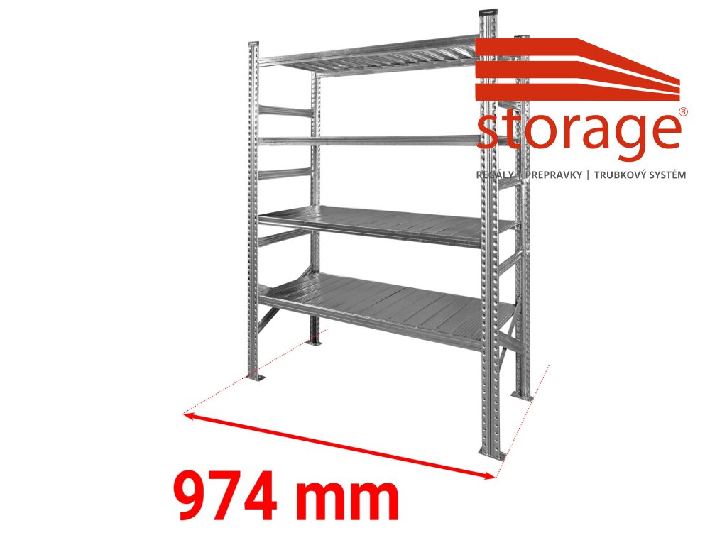 Pri návrhu priestoru počítajte s tým, že celková vonkajšia šírka je 974 mm, nakoľko stojiny mierne presahujú rozmer samotnej police. Tento produkt tvorí základné pole (samostatne stojace), ktoré je možné kedykoľvek rozšíriť o lacnejšie prídavné polia pre vytvorenie stabilných a cenovo výhodných regálových radov.