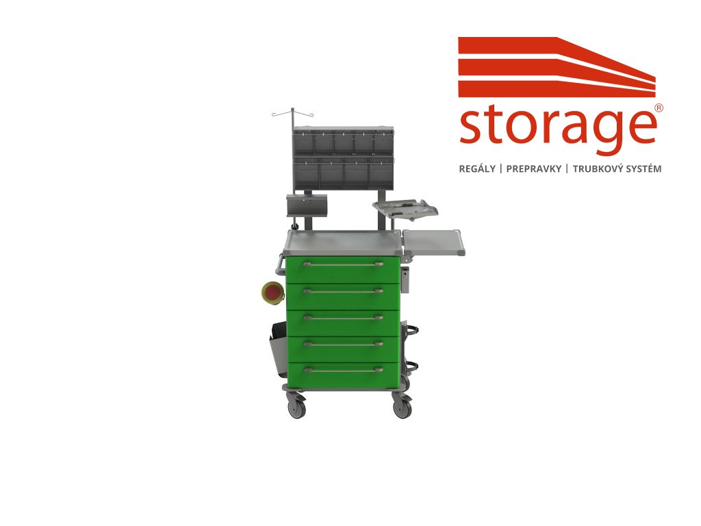 Vzorová zostava resuscitačného vozíka. Produkt je možné upraviť požiadavkám a potrebám zákazníka. Vybavenie vozíka na obrázku viď. popis nižšie. Konštrukcia vozíka môže byť oceľová, ošetrená šedou antimikrobiálnou farbou alebo v nehrdzavejúcom AISI304 prevedení. Vozík má antivibračnú výstuhu. Pracovná plocha vozíka z nehrdzavejúcej ocele AISI304 s 12 mm prelisom, ochrannými rohmi a nosnosťou 20 kg. Čelá zásuviek sú z kompaktného plastu (ABS), farba je voliteľná zo vzorkovníka. Zásuvky môžu byť klasické alebo určené na skladovanie MS košov. Zásuvky sú vybavené guličkovým plnovýsuvom, s doťahovaním a dotlmením. Nosnosť zásuviek je 20 kg. Zásuvky sú centrálne uzamykateľné. Produkt je vybavený: 5 x zásuvka veľkosti M. Vozík je vybavený aj oceľovým madlom, AISI304. Kolesá vozíka sú plastové, s plastovými nárazníkmi. Priemer kolies je 125 mm, z toho 2 s brzdou. Celková nosnosť výrobku je 150 kg. Vozík na obrázku je vybavený: - infúzny stojan 5761, - 9 x plastový výklopný box 5770, - antikorový držiak na 100 ks rukavíc 5781, - antikorový otočný stolík so zaisťovacími pásmi 5756, - držiak nádoby na použité ihly 5757, - antikorový držiak na dokumenty 5755, - antikorový sklopný stolík s prelisom 5753ZN, - antikorový otvárač ampuliek 5763, - antikorový držiak na 2 kg kyslíkovú fľašu 5758, - lišta s elektrickými zásuvkami 5787, - resuscitačná podložka 5762.