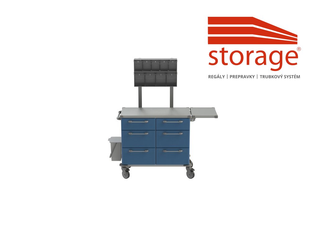 Vzorová zostava vozíka na sadrovanie pacientov. Produkt je možné upraviť požiadavkám a potrebám zákazníka. Vybavenie vozíka na obrázku viď. popis nižšie. Konštrukcia vozíka môže byť oceľová, ošetrená šedou antimikrobiálnou farbou alebo v nehrdzavejúcom AISI304 prevedení. Vozík má antivibračnú výstuhu. Pracovná plocha vozíka z nehrdzavejúcej ocele AISI304 s jemným prelisom, ochrannými rohmi a nosnosťou 20 kg. Čelá zásuviek sú z kompaktného plastu (ABS), farba je voliteľná zo vzorkovníka. Zásuvky sú určené na skladovanie MS košov. MS koše sú v dvoch veľkostiach: STANDARD a MINI, obe sa dajú rozdeliť priečkami. Nosnosť štandardnej zásuvky je 20 kg a nosnosť mini zásuvky je 10 kg. Zásuvky sú vybavené guličkovým plnovýsuvom, s doťahovaním a dotlmením. Zásuvky sú centrálne uzamykateľné. Produkt je vybavený: 2 x ¾ zásuvka veľkosti M (výška 120 mm), 4 x ¾ zásuvka veľkosti L (výška 200 mm). Vozík je vybavený aj oceľovým madlom, AISI304. Kolesá vozíka sú plastové, s plastovými nárazníkmi. Priemer kolies je 125 mm, z toho 2 s brzdou. Celková nosnosť výrobku je 150 kg. Vozík na obrázku je vybavený: - 9 x plastový sklopný box 5770, - vyberateľný plastový kôš 5754A, - antikorový sklopný stolík s prelisom 5753ZN.