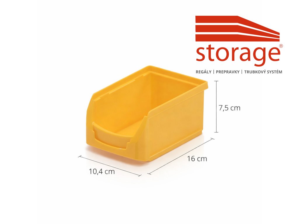 Žltá skosená prepravka 16 × 10,4 × 7,5 cm z PP plastu s objemom 0,8 l a nosnosťou 2 kg je ideálna na ukladanie drobných dielov, súčiastok či spojovacieho materiálu. Vďaka odolnému materiálu a praktickému tvaru nájde využitie v skladoch, dielňach aj domácnosti.