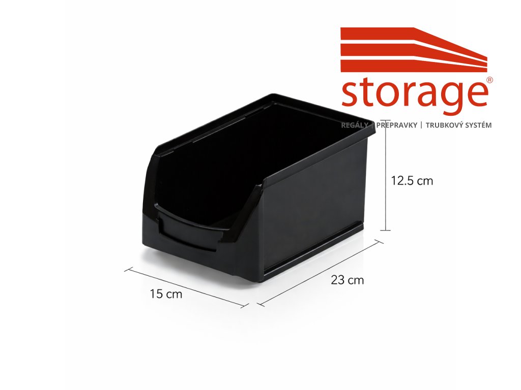 Čierna skosená prepravka 23 × 15 × 12,5 cm z PP regranulátu s objemom 3 l a nosnosťou 5 kg je určená na skladovanie súčiastok, dielov a spojovacieho materiálu. Vďaka pevnej konštrukcii z recyklovaného materiálu je ekologická a vhodná pre priemyselné aj dielenské využitie.