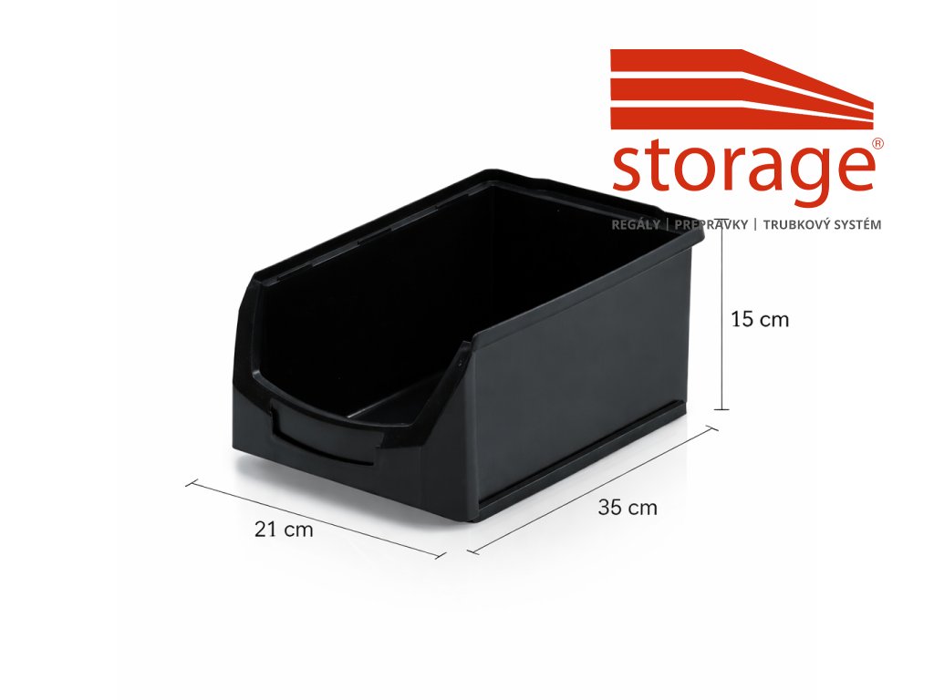 Čierna skosená prepravka 35 × 21 × 15 cm z PP regranulátu s objemom 7 l a nosnosťou 10 kg je ideálna na skladovanie väčších dielov, súčiastok a spojovacieho materiálu. Vďaka odolnej konštrukcii z recyklovaného materiálu ponúka pevnosť, ekologické riešenie a dlhú životnosť.