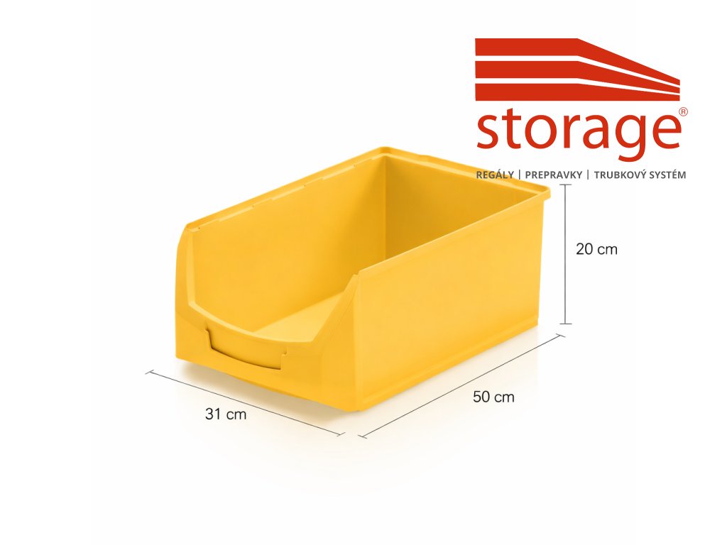 Žltá skosená prepravka 50 × 31 × 20 cm z PP plastu s objemom 24 l a nosnosťou 20 kg poskytuje priestranné riešenie na uloženie väčších dielov, súčiastok a náradia. Odolná konštrukcia a praktický tvar zaručujú spoľahlivé využitie v skladoch, výrobných prevádzkach aj dielňach.