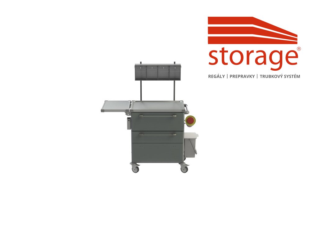 Vzorová zostava vozíka na vizity pacientov. Produkt je možné upraviť požiadavkám a potrebám zákazníka. Vybavenie vozíka na obrázku viď. popis nižšie. Konštrukcia vozíka môže byť oceľová, ošetrená šedou antimikrobiálnou farbou alebo v nehrdzavejúcom AISI304 prevedení. Vozík má antivibračnú výstuhu. Pracovná plocha vozíka z nehrdzavejúcej ocele AISI304 s 12 mm prelisom, ochrannými rohmi a nosnosťou 20 kg. Čelá zásuviek sú z kompaktného plastu (ABS), farba je voliteľná zo vzorkovníka. Zásuvky môžu byť klasické alebo určené na skladovanie MS košov. Zásuvky sú vybavené guličkovým plnovýsuvom, s doťahovaním a dotlmením. Nosnosť zásuviek je 20 kg. Zásuvky sú centrálne uzamykateľné. Produkt je vybavený: 1 x zásuvka veľkosti L, 1 x zásuvka veľkosti XL so zakladačom na dokumenty. Zakladač má kapacitu 16 zložiek A4, oddeľovacie priečky sú vyberateľné, nosnosť zásuvky je 40 kg. Vozík je vybavený aj oceľovým madlom, AISI304. Kolesá vozíka sú plastové, s plastovými nárazníkmi. Priemer kolies je 125 mm, z toho 2 s brzdou. Celková nosnosť výrobku je 150 kg. Vozík na obrázku je vybavený: - 4 x sklopný plastový box 5776, - antikorový sklopný stolík s prelisom 5753ZN*, - antikorový otvárač ampúl 5763, - držiak nádoby na použité ihly 5757, - plastový odpadkový kôš 5754C*.